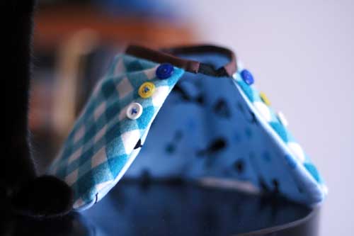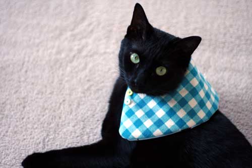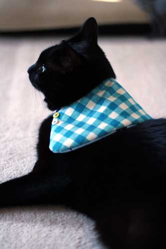 影千代くんのビロードのような艶やかな黒の毛色に、ブルーと白のチェックが一層華やいで見えますね