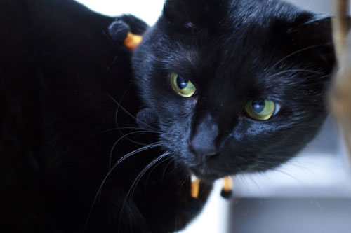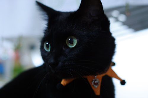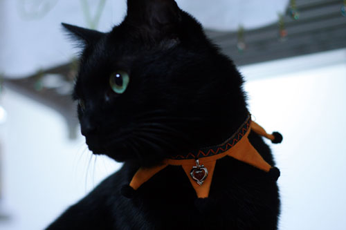 やはり、艶々な漆黒の猫さんには鮮やかな色が似合いますね。