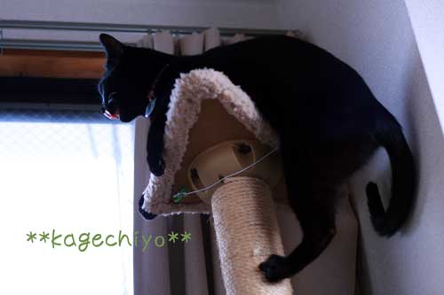 おとうはんに誘導されて、嬉しそうにキャットタワーに上った影千代さま