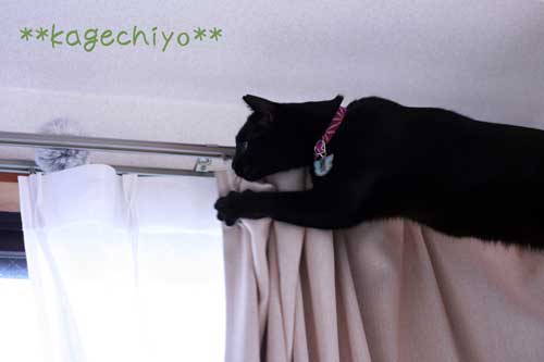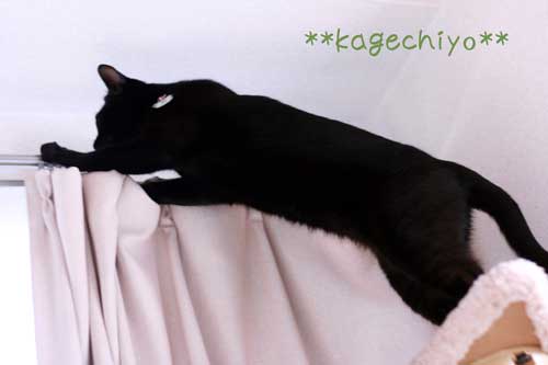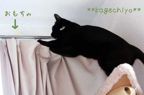 届きそうで届かないカーテンレールの上に玩具を引っ掛けましたw