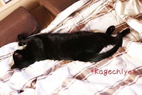 ふと寝室を覗くと・・・ベッドを占領して黒猫が伸び寝してましたw