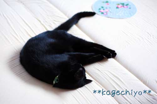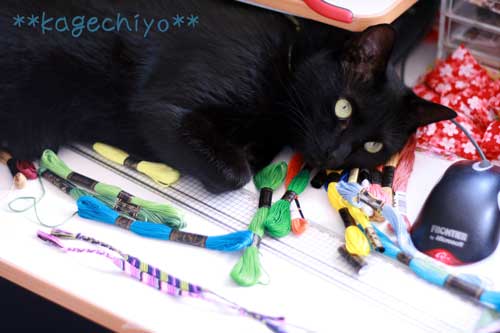 でも、色とりどりの刺繍糸を敷いてねそべる影ちゃんの