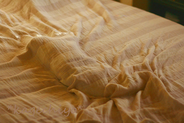 日差しのがんがん当たる寝室のベッド。