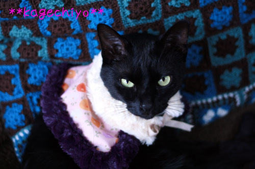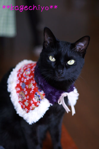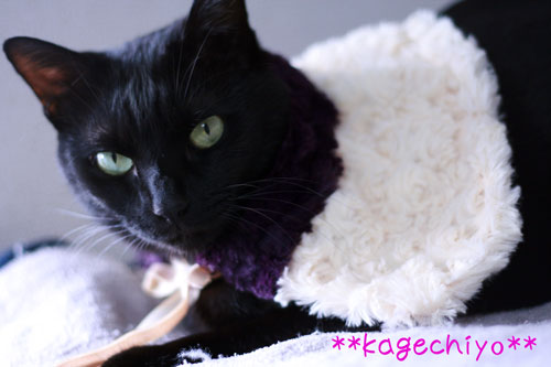シュリさん、ブログではあんまり登場しないけど、結構衣装持ちなんですよね。ちゃんと自分の服がクローゼットにかかってるんですが、あれね、やっぱり猫ちゃんには袖がないタイプ、つまりこんなケープタイプが絶対良いですよね!