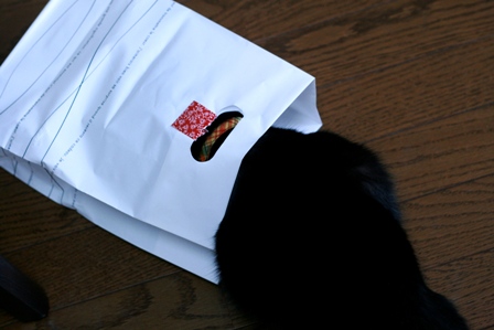 お菓子の入っていた袋に顔を突っ込み