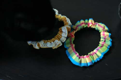これは山吹いろのシックな布地に白いレースを付けたもの。