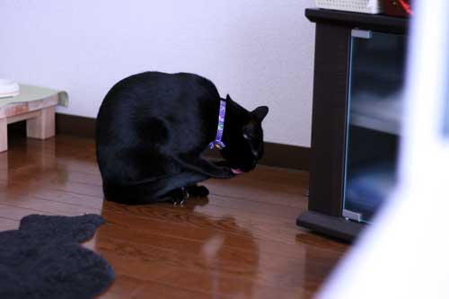 尻尾を舐めて飢えを凌いでいる影千代さま。