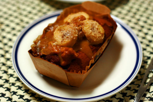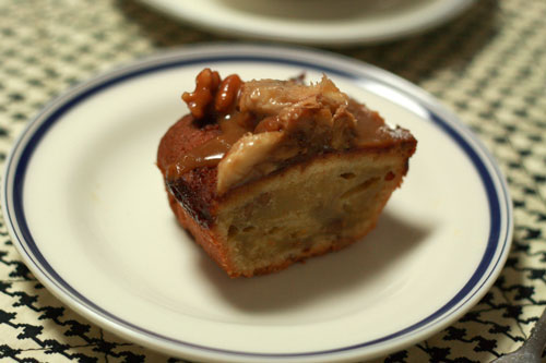 つぶしたバナナとクルミのパウンドケーキに、キャラメルソースのかかったバナナのトッピング♪