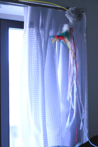 出窓のカーテンレールに、お気に入りの玩具を挿しただけw