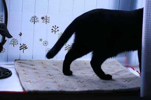 出窓のカゴベッドの隣にある、偵察用マットの上