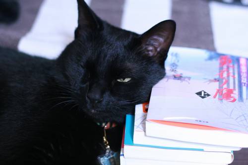 影ちゃん、山盛りの本を枕にして昼寝とは、感想文の宿題