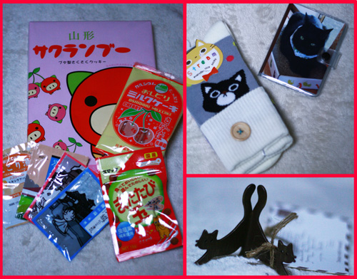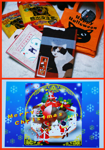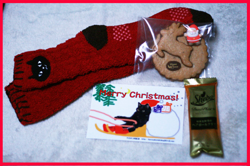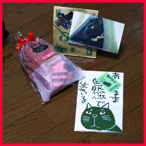 可愛い黒猫手拭いやお菓子の詰め合わせ、そしてもこもこの黒猫ソックス~