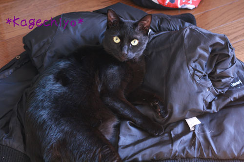 影千代さまは、脱いだ乳母のダウンジャケットをズカズカと寝床にしてご立腹。