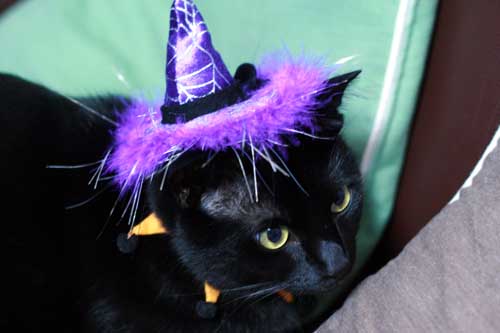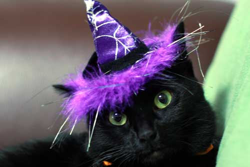 黒猫にパープルのファー付きトンガリ帽子。