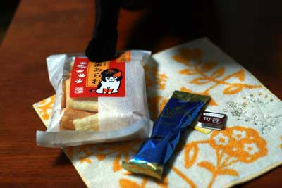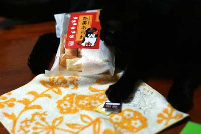 たまあられ、パッケージも可愛いですね☆影千代くんもたま駅長が気になるのかな?!