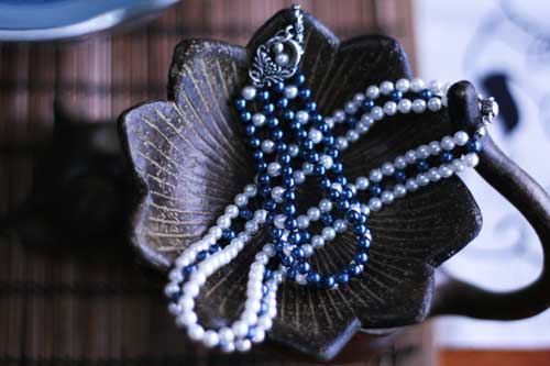 ホワイト&メタルブルーのパールビーズを連ねたクールなデザイン・・・・。