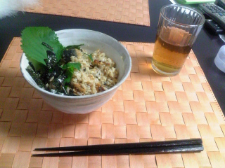 14:00 自分の昼食。海苔を食わせろと食卓に飛び乗ろうとする猫と