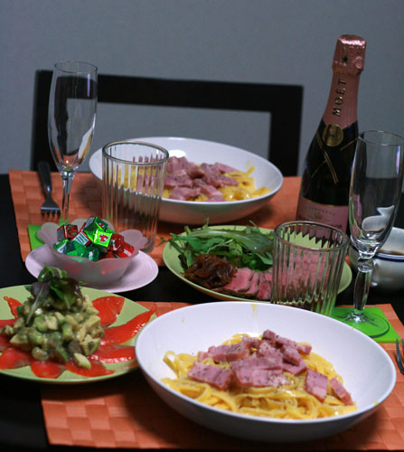 学校があったので簡単ですが、カルボナーラ・ローストビーフ・スモークサーモンとアボガドのマリネ♪